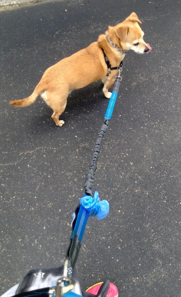 I tried to tape the bothersome hamstring — it wasn’t bothering me much, but it was there, ya know? Headed out and warmed up with Bandit for a couple of miles using the new hands free leash.
