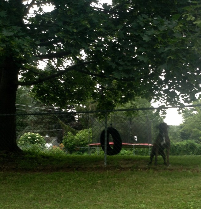 Mr. Judy warned me it might rain — I wish it had! Although the humidity wasn’t too bad, it was cloudy, and there was a nice breeze. Tried to get a pic of the big and little dogs on each side of the tire, but the minute I crossed the road to get closer they started to bark and run the fence line.