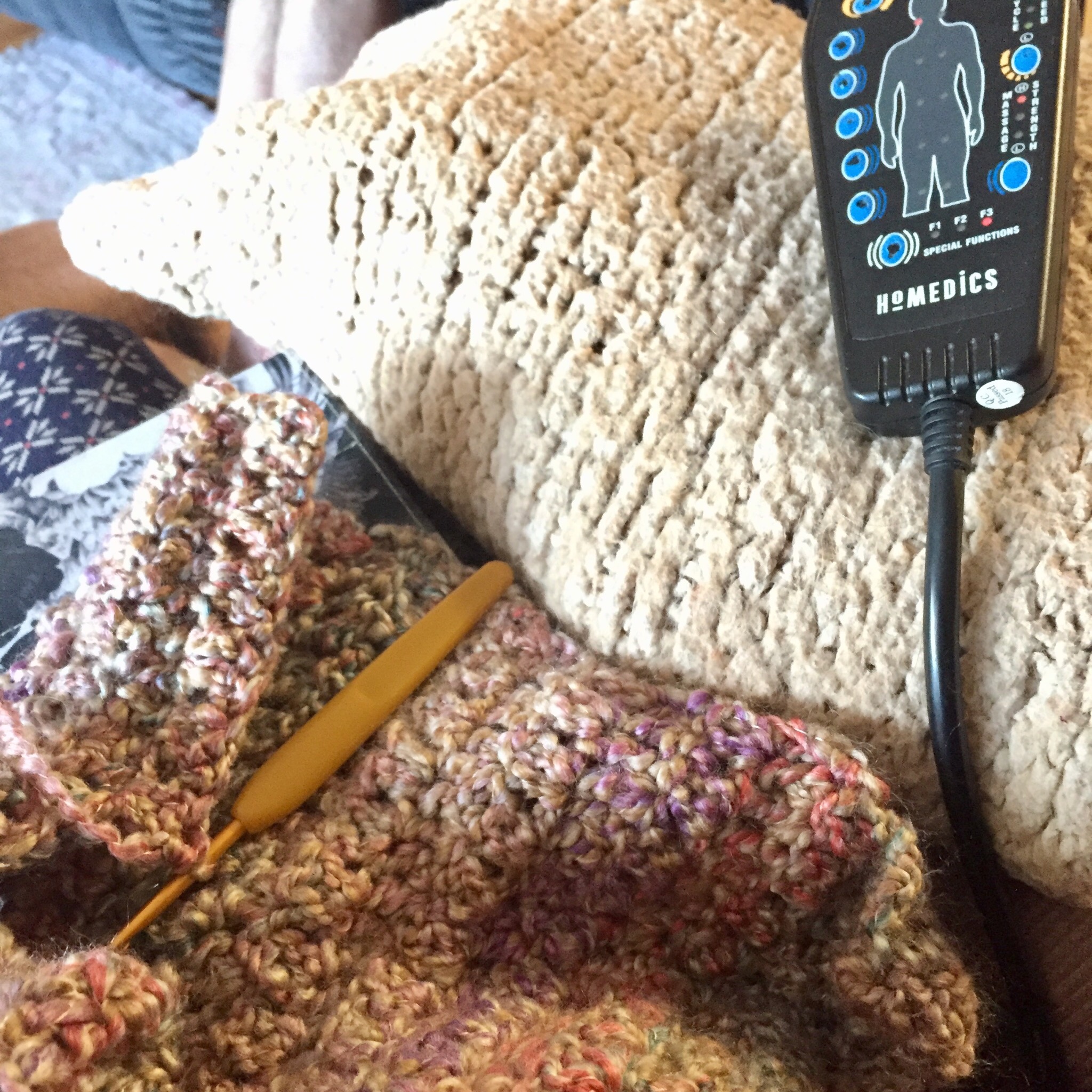And speaking of crocheting, my original plan for Saturday was to run later in the day, when it was only cold, not brutally cold. So I got out my massage seat and had it going while I crocheted . . . heaven. But then my throat was scratchy and I was tired so I stayed in my jammies most of the day anyway.