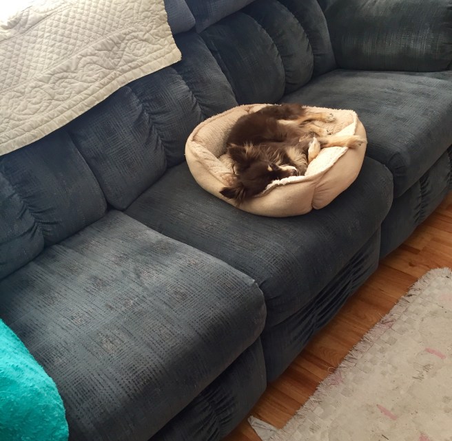 In addition, she is picking up bad habits from Bandit. She now drags the dogbed on the couch from its corner to the other end of the couch. She never did this before Bandit arrived in our lives. Why can’t they pick up good behaviors from each other?