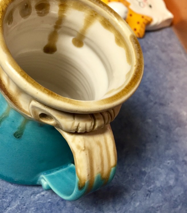 I was afraid I would have trouble with tea spilling from the lip, as I’ve found lips like that have a tendency to dribble, but the first drink was a success. I have found when the mug goes in like that, even if it’s larger, it tends to keep the tea warmer longer. And I just love the design — it reminds me of the beach (even if we never went to the beach in Savannah!).