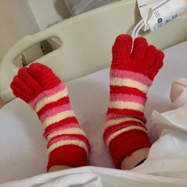 Thanks! Better, but my stomach is still grumbling so still mostly eating bland foods (which is getting kind of old!). The socks were a big hit with everyone. Weird that I chose them that morning cause I’ve just been in slippers ever since.