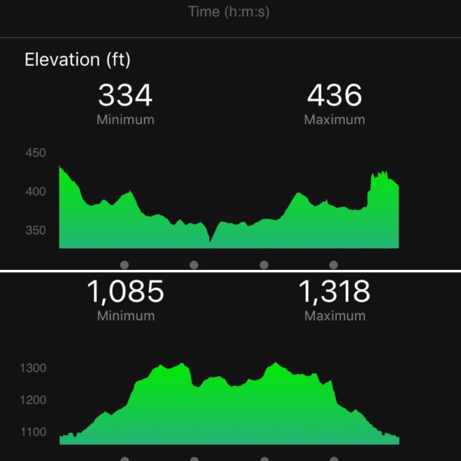 Insert evil laugh here. I did this trail running festival a couple of years ago when there was a 5k option. The 5k wasn’t too hilly. The graphic above shows my run on Thursday, and the elevation, vs my run today and its elevation.