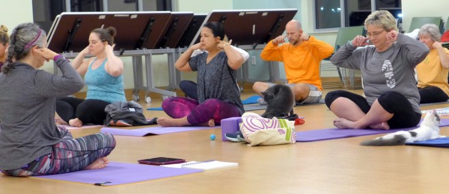 1. There were 4 cats (well, several were kittens, and 1 was 15). None of them did down dog, apparently (I was too busy teaching to really notice, but Mr. Judy was the one taking the photographs), but they were indeed weaving around — and sometimes laying with — the students. Or scratching mats. 🙂