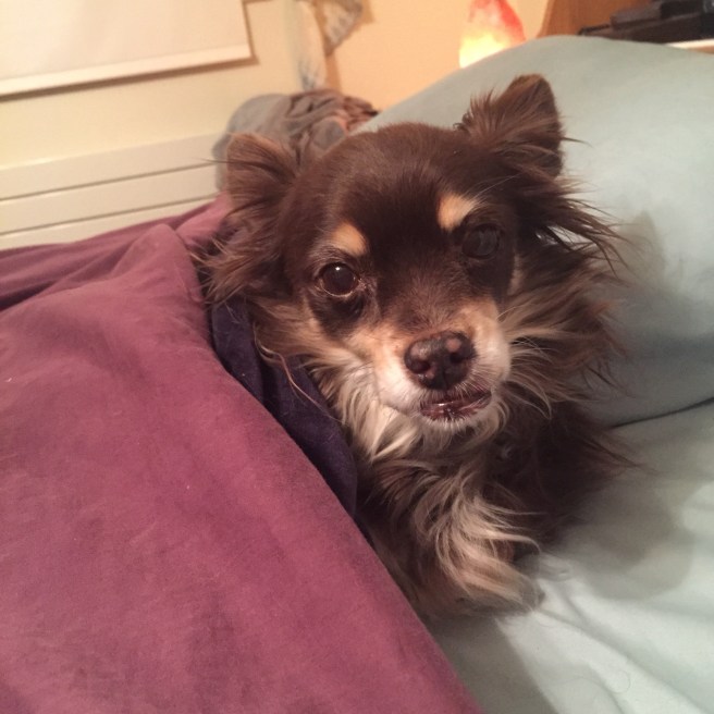I’m pretty sure it wasn’t there when I was talking to Mr. Judy, we didn’t hear anything (Bandit tends to do it pretty quietly). It wasn’t me and it wasn’t Mr. Judy. Good thing the dogs are cute, and at least this time they missed bedding, furniture, and carpeting.