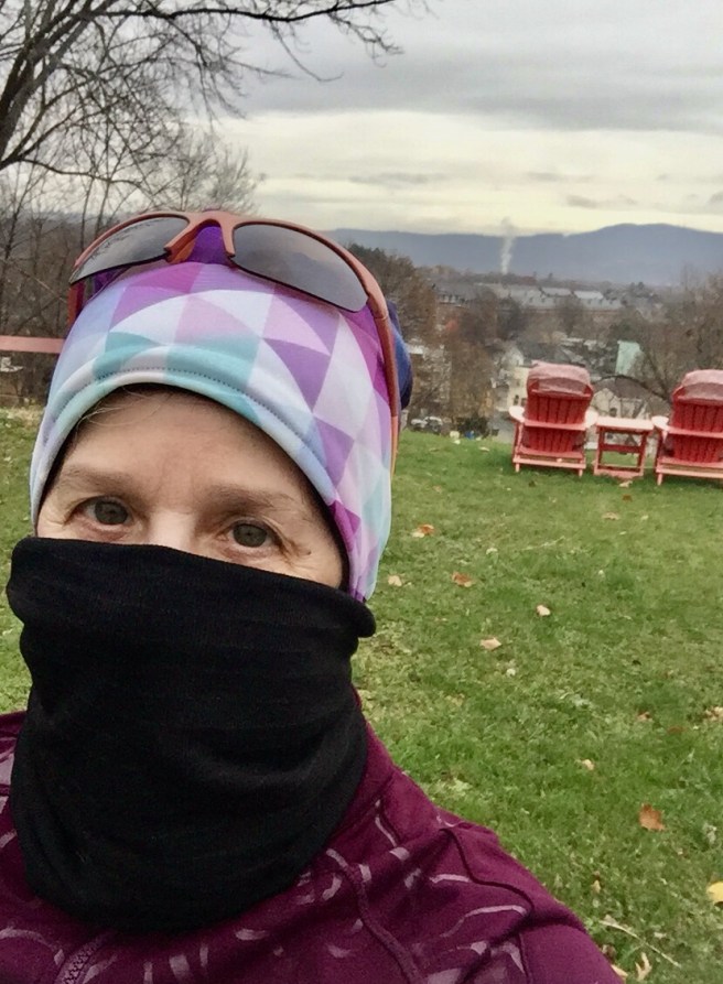 I like gaiters for cold winter runs to protect the lungs, but it’s so hard to find one that stays up! I don’t see many people when I run so I don’t wear a mask for the entire run, but this time of year I do pull up my Buff if I cross someone.