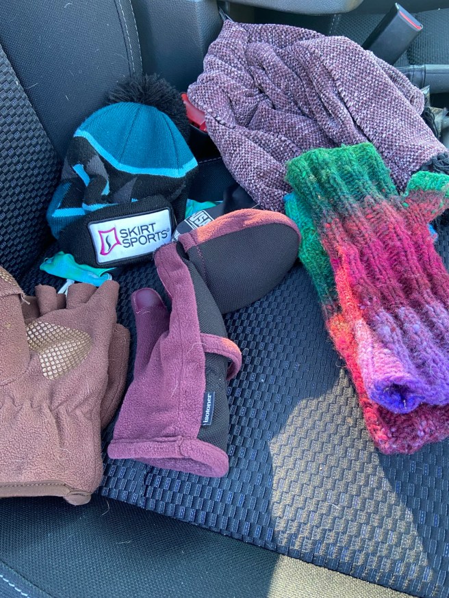 I headed out to my moms with plans to hike along the way, and it was sort of warm — for December. So I took several different pairs of gloves — or so I thought. I’d brought a pair of fingerless wrist warmers I knitted long ago. I brought gloves, too, in case I thought the wrist warmers wouldn’t be warm enough. I got there and yeah, it was a bit chillier than expected.
