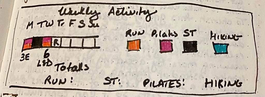 Not too long ago I added a simple monthly mood tracker that I really enjoy. Recently I added a weekly activity tracker. So even if I don’t start a weekly run down post until the day of the linkup, I actually know how often I’ve done ST, Pilates, etc. — and have an actual written record of my runs. I’m loving it!