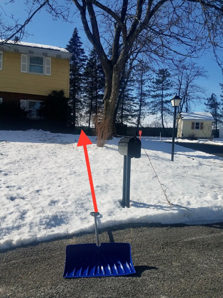 Crazy winds on Friday blew this shovel from the garage (to the right of the house at the top of the driveway) to the mailbox